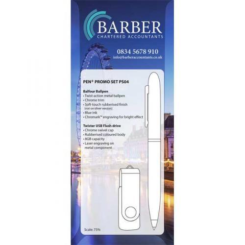 The quoted price includes: Engraved on pen and flash drive and full colour on the card