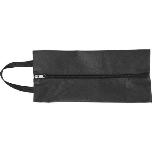 Non-woven (80g/m2) shoe bag, extendable up to 12 cm on each side, with a zip over the entire length and a polyester carry strap (approx. 2 x 23 cm).