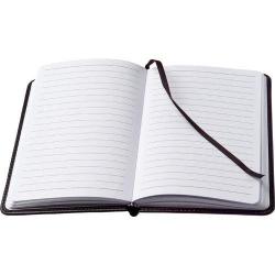 Notebook bound in a PU cover with approximately one hundred lined sheets and a ribbon marker.
