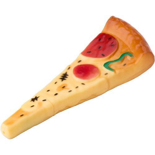 Plastic ballpen in the shape of a pizza slice with, blue ink.