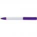 Plastic ballpen with a white barrel and coloured trim, blue ink.