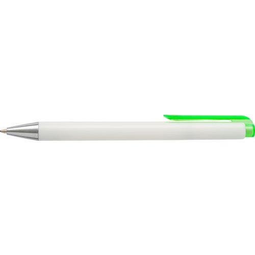 Plastic ballpen with solid white barrel and translucent coloured clip and push button, blue ink.